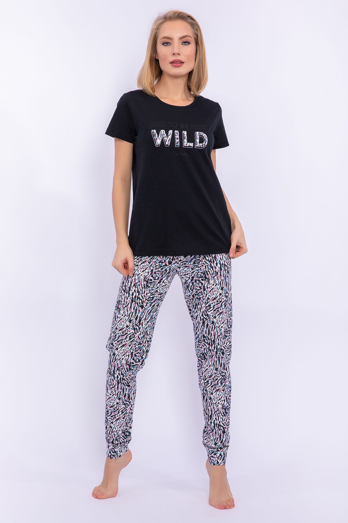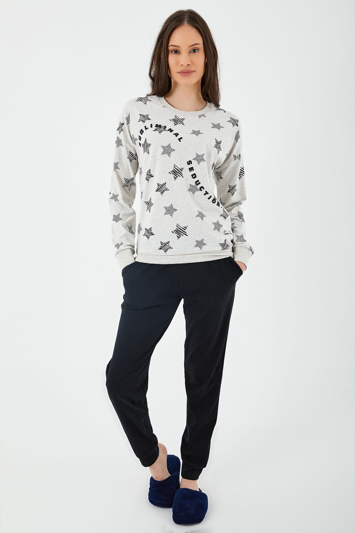 PC8405-S طقم بيجاما ماركة بيير كاردان قطعتين قطن خريفي للنساء بلوز مرسوم عليها بالنجوم مع بنطال اسود