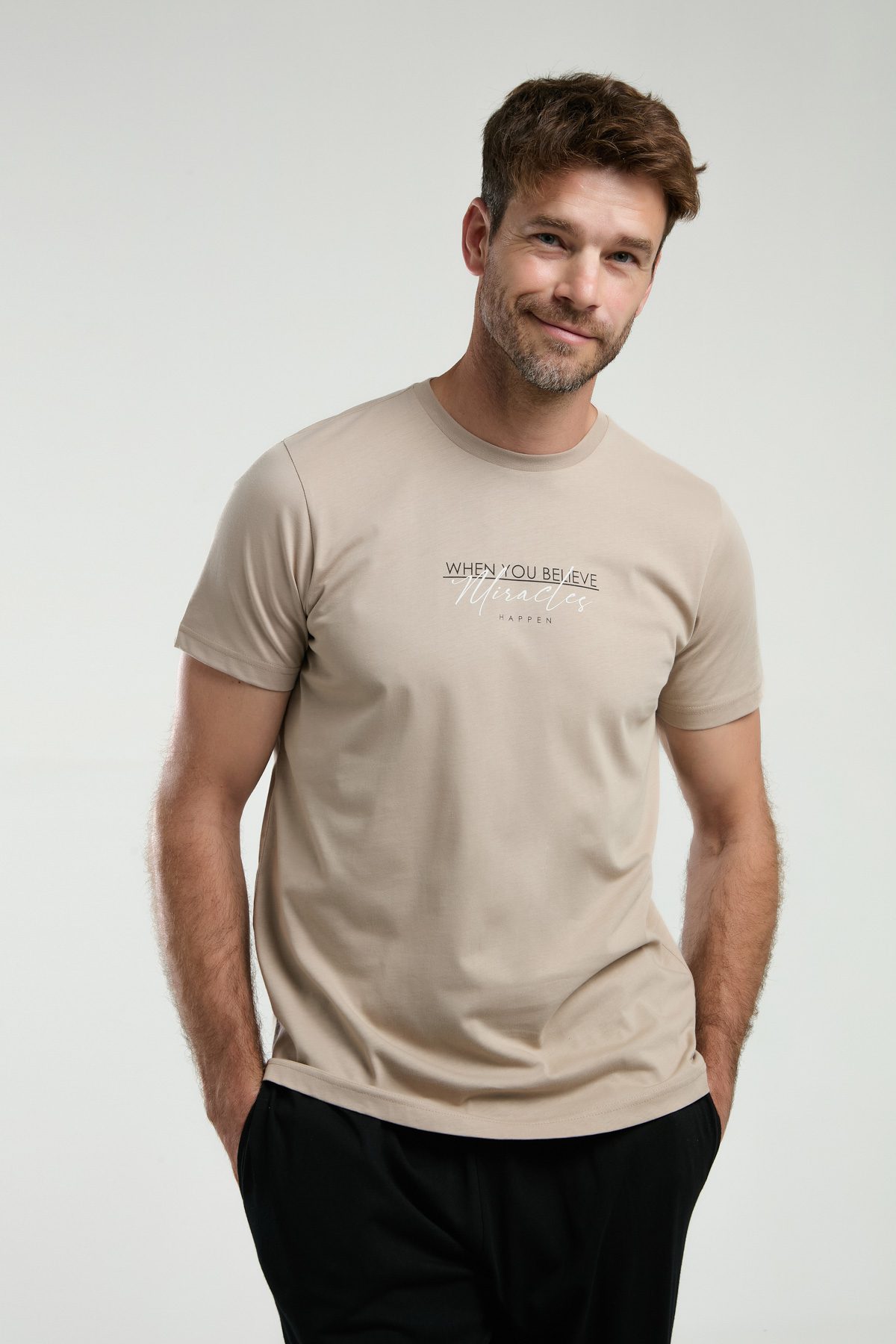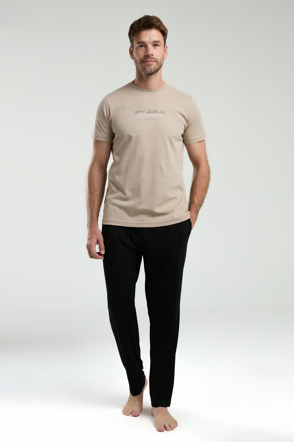 AR3010 طقم بيجاما قطن للرجال قطعتين بلوز لون كريمي مع بنطال لون اسود