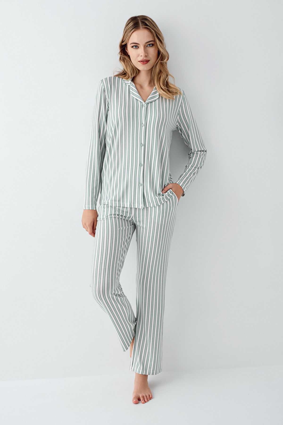 AR3408-S طقم بيجاما قطن بأزرار للنساء مخططة باللون الاخضر