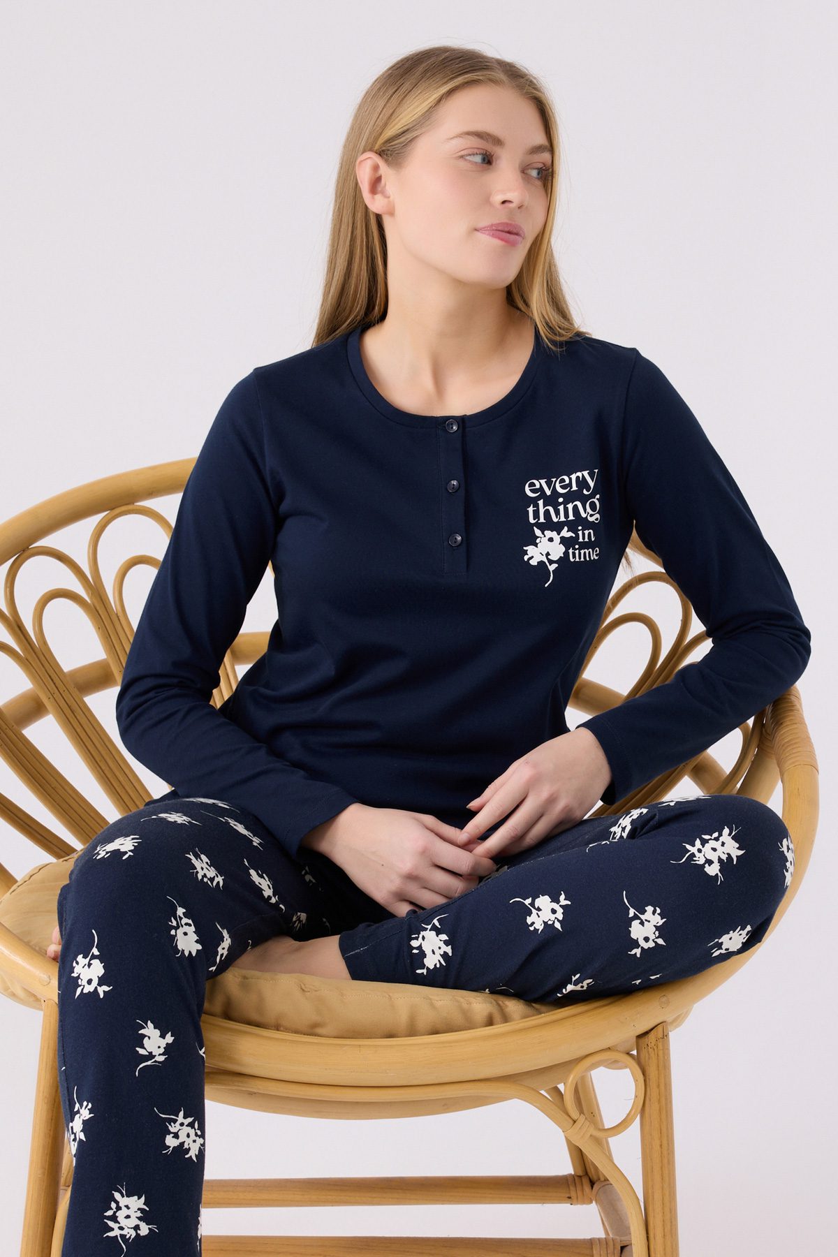 AR3056 طقم بيجاما قطن ربيعي للنساء قطعتين لون كحلي
