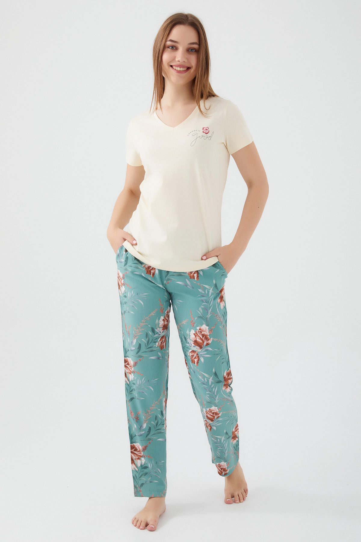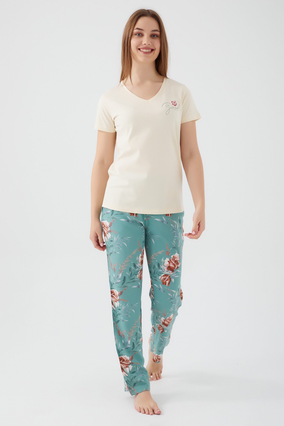 AR2414-S طقم بيجاما قطن قطعتين بلوز لون كريمي مع بنطال مرسوم