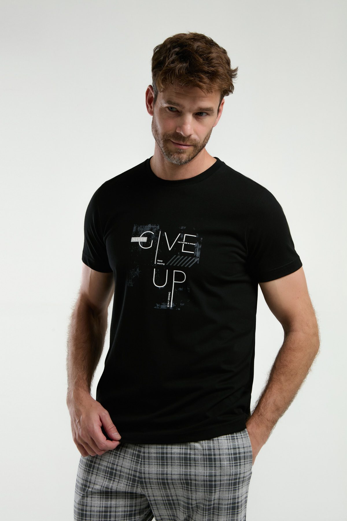 AR3350 طقم بيجاما قطن قطعتين بنطال كاروهات مع بلوز لون اسود