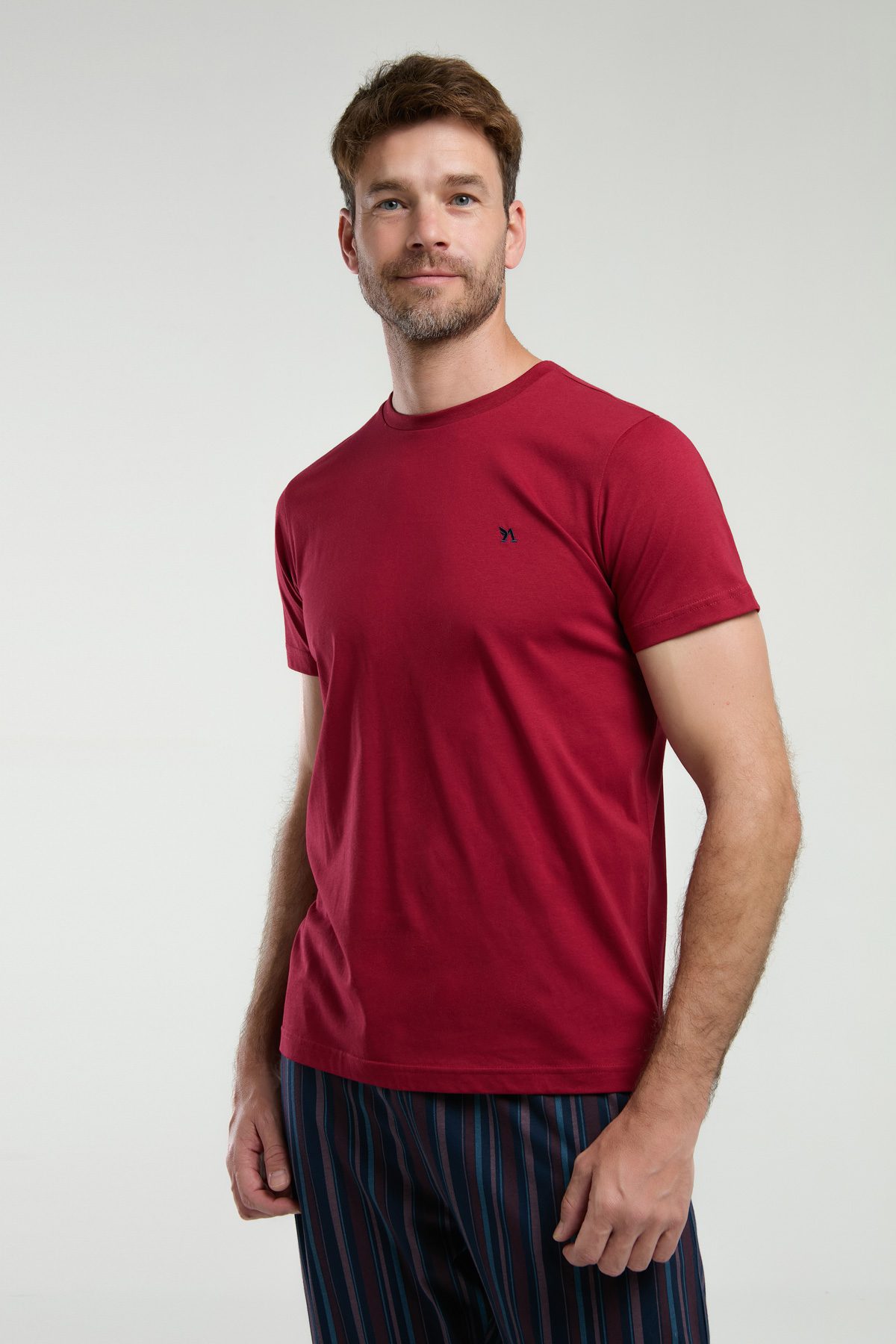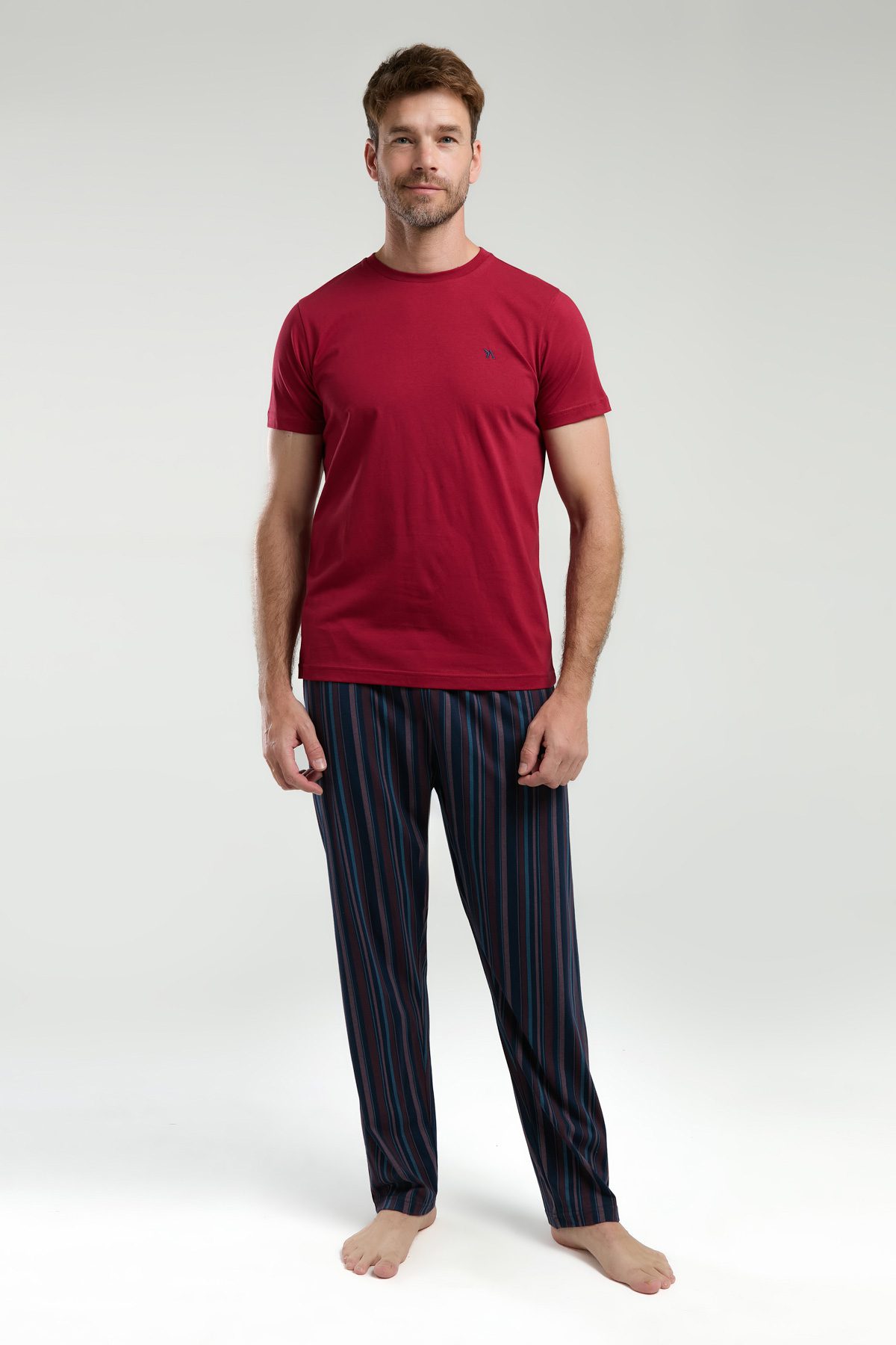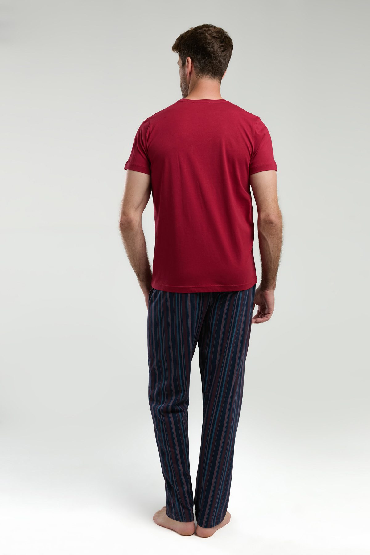 AR3352-S طقم بيجاما قطن للرجال قطعتين بلوز لون برغندي مع بنطال مقلم