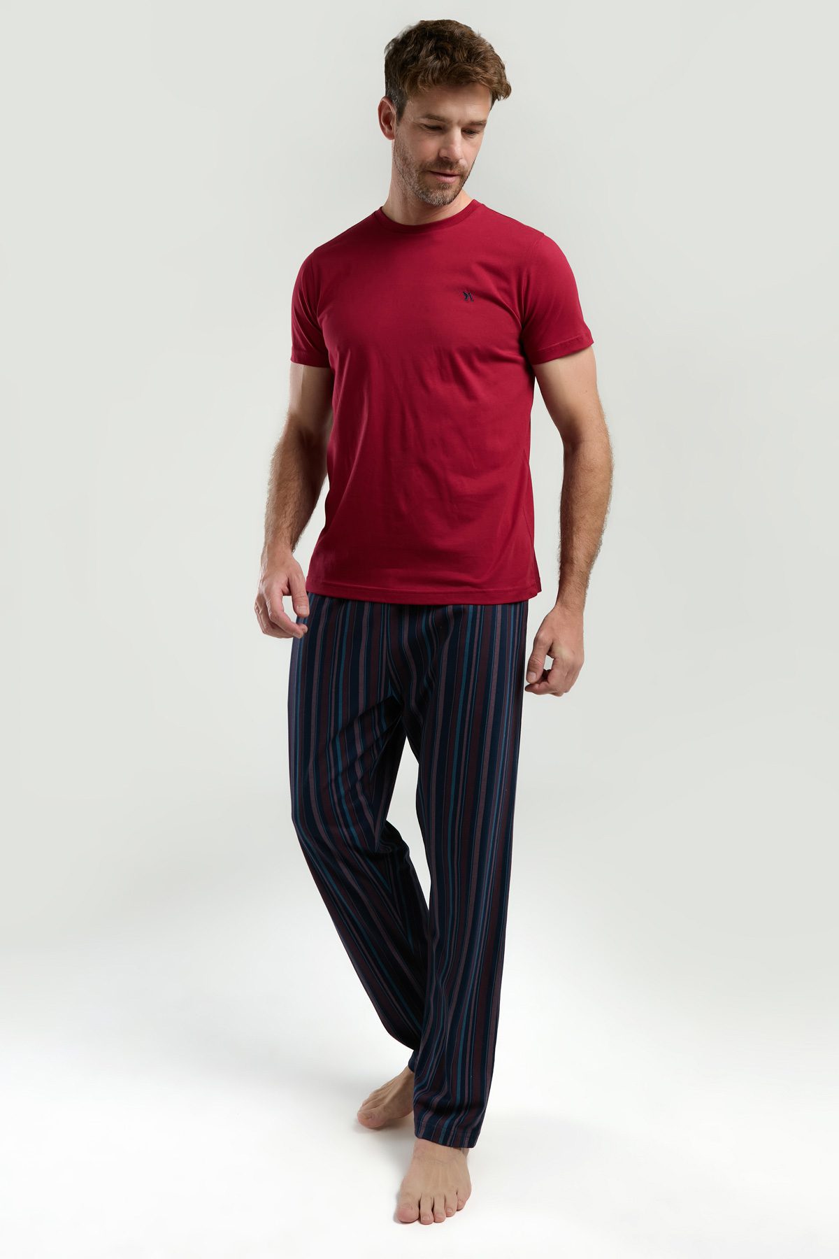 AR3352-S طقم بيجاما قطن للرجال قطعتين بلوز لون برغندي مع بنطال مقلم