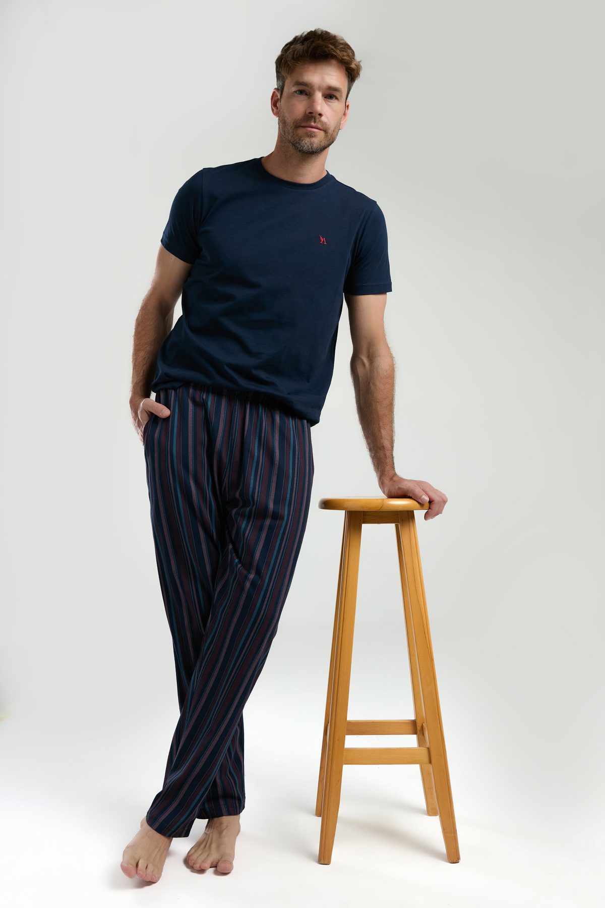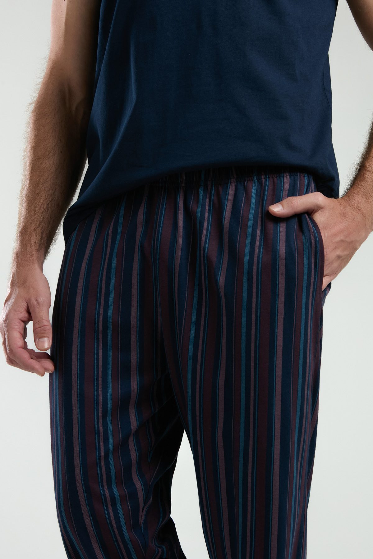 AR3352-S طقم بيجاما قطن للرجال قطعتين بلوز لون كحلي مع بنطال مقلم