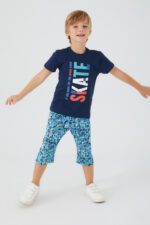 RP3050 طقم للاولاد قطعتين قطن بلوز لون كحلي مع برمودا لون ازرق سماوي مرسوم