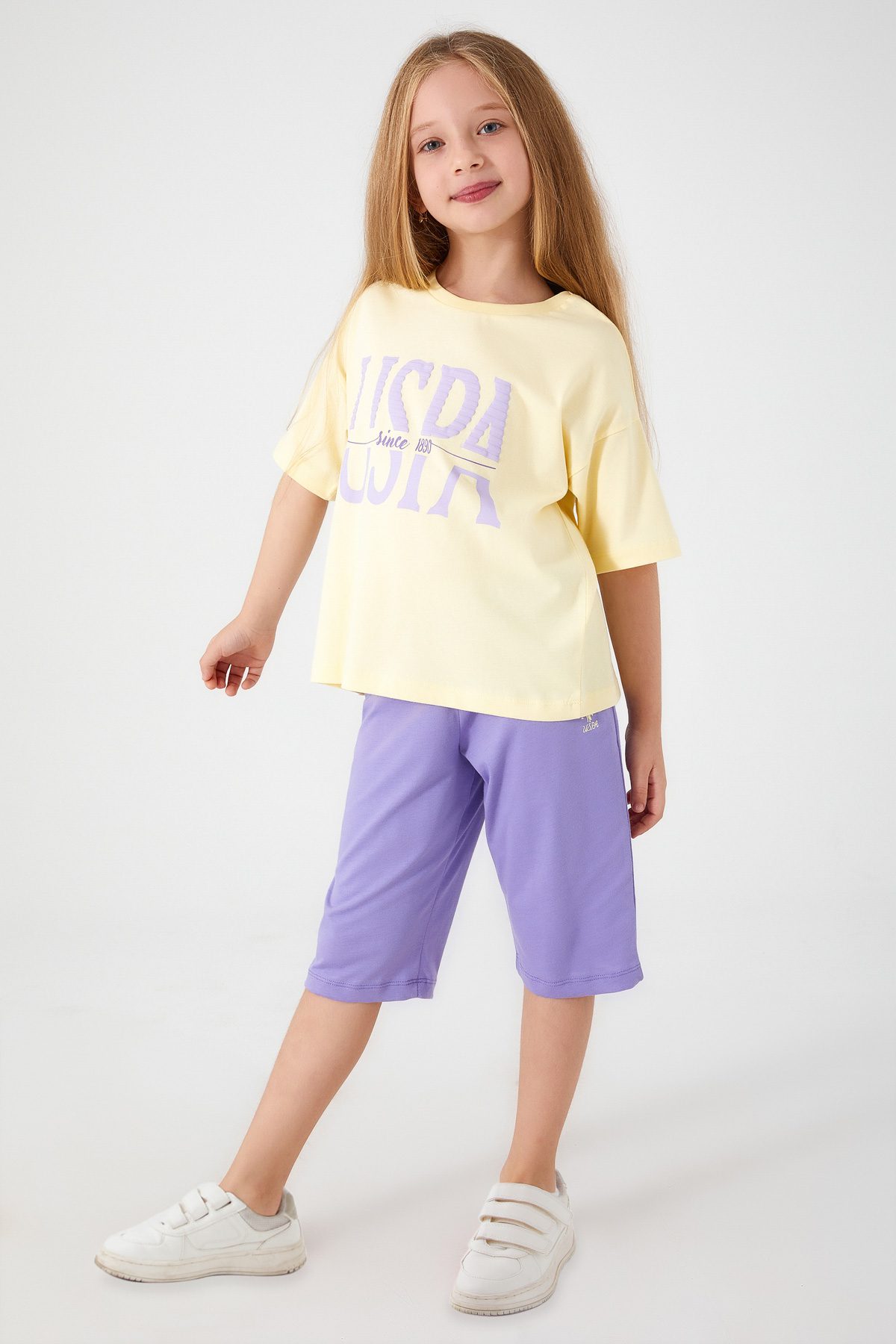 US2091 US POLO ASSN طقم للفتيات بنطال برمودا قطن قطن 100% متوفر من عمر 4-14 سنة نسيجها القطني عالي الجودة