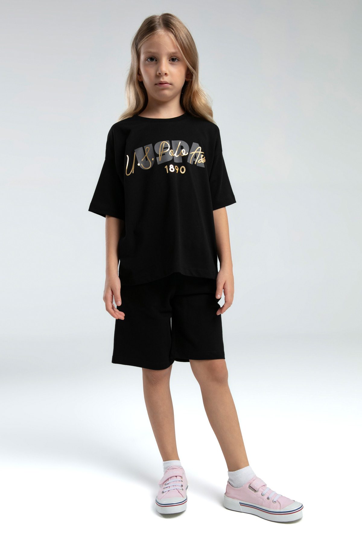 US2080 US POLO ASSN طقم شورت قطعتين للفتيات لون اسود قطن